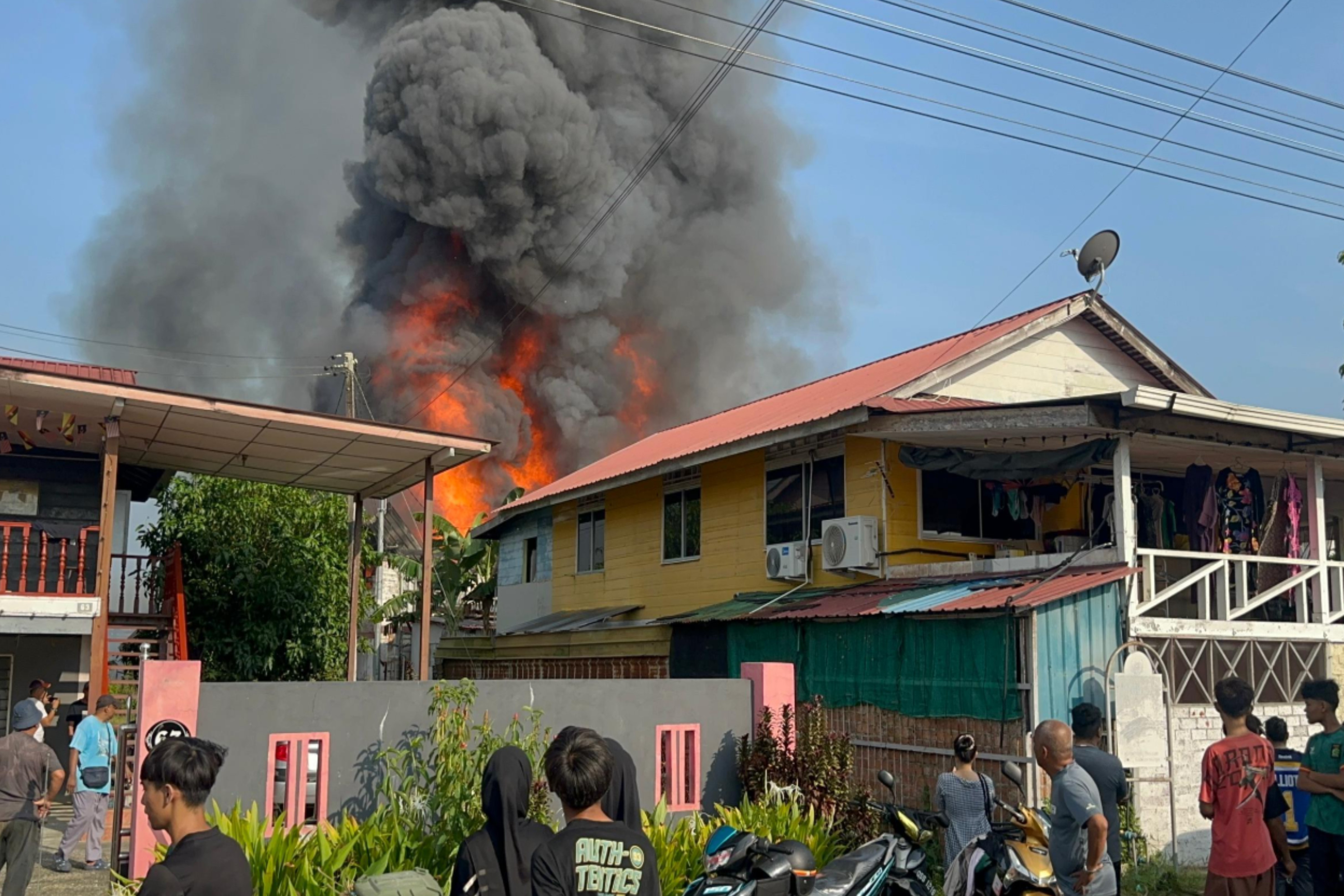 Penduduk menyaksikan lima buah rumah musnah dalam kebakaran di Kampung Hilir,Sibu pagi tadi
