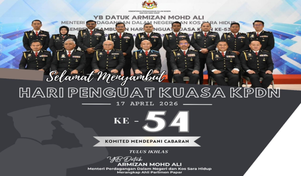 PUTRAJAYA,17 April – Menteri Perdagangan Dalam Negeri dan Kos Sara Hidup,Armizan Mohd Ali merakamkan penghargaan kepada seluruh warga penguat kuasa Kementerian Perdagangan Dalam Negeri dan Kos Sara Hidup (KPDN) atas dedikasi dan komitmen mereka dalam melindungi kebajikan rakyat.